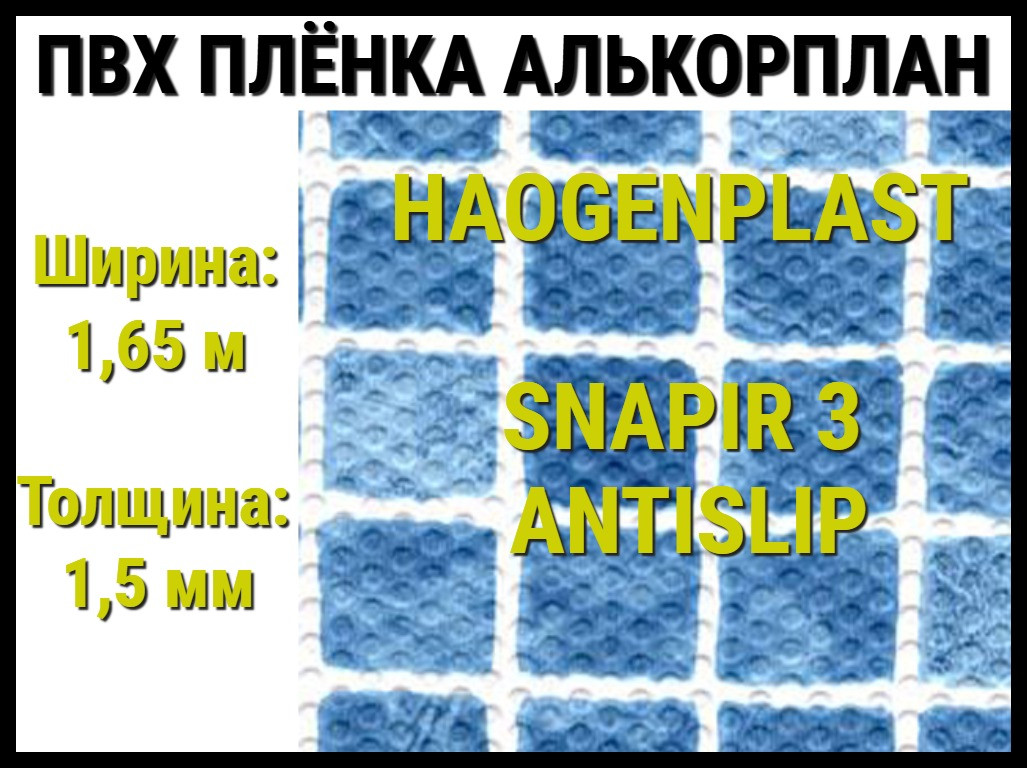 Пвх пленка Haogenplast Snapir 3 Antislip - обладает высокой механической прочностью, хорошей термопластичностью, она устойчива к влиянию ультрафиолетовых лучей и большим перепадам температур. Пленка хорошо сваривается, обладает хорошей устойчивостью к старению, а также в достаточной степени противостоит средствам по уходу за водой. Покрытие "Haogenplast" обладает уникальными защитными свойствами. Её пропитывают специальными составами, которые предотвращают развитие микрофлоры. Биологическая пропитка защищает пленку от воздействия грибков, спор, микроорганизмов и разнообразных бактерий, которые находятся в воде. Пленка "Haogenplast" имеет армирующий слой, изготовленный на основе сетки, полученной из полистирольного волокна, обеспечивающего максимальный коэффициент механического сопротивления по отношению к возможным разрывам и каким-либо внешним деформациям. Благодаря наличию между составляющими ингредиентами пленки молекулярной связи в процессе производства пленки образуется однородное прочное эластичное покрытие, толщина которого составляет 1,5 мм.
